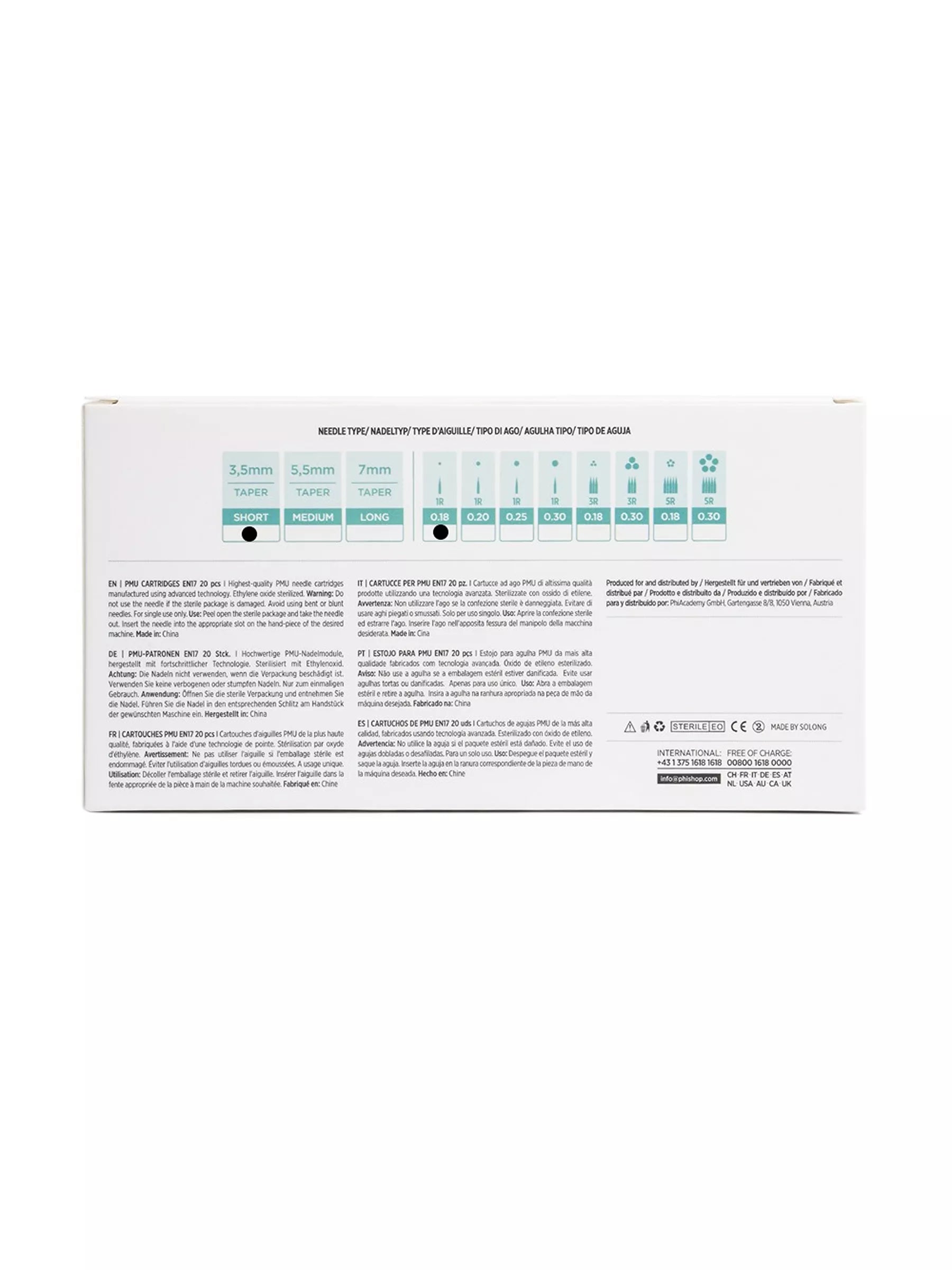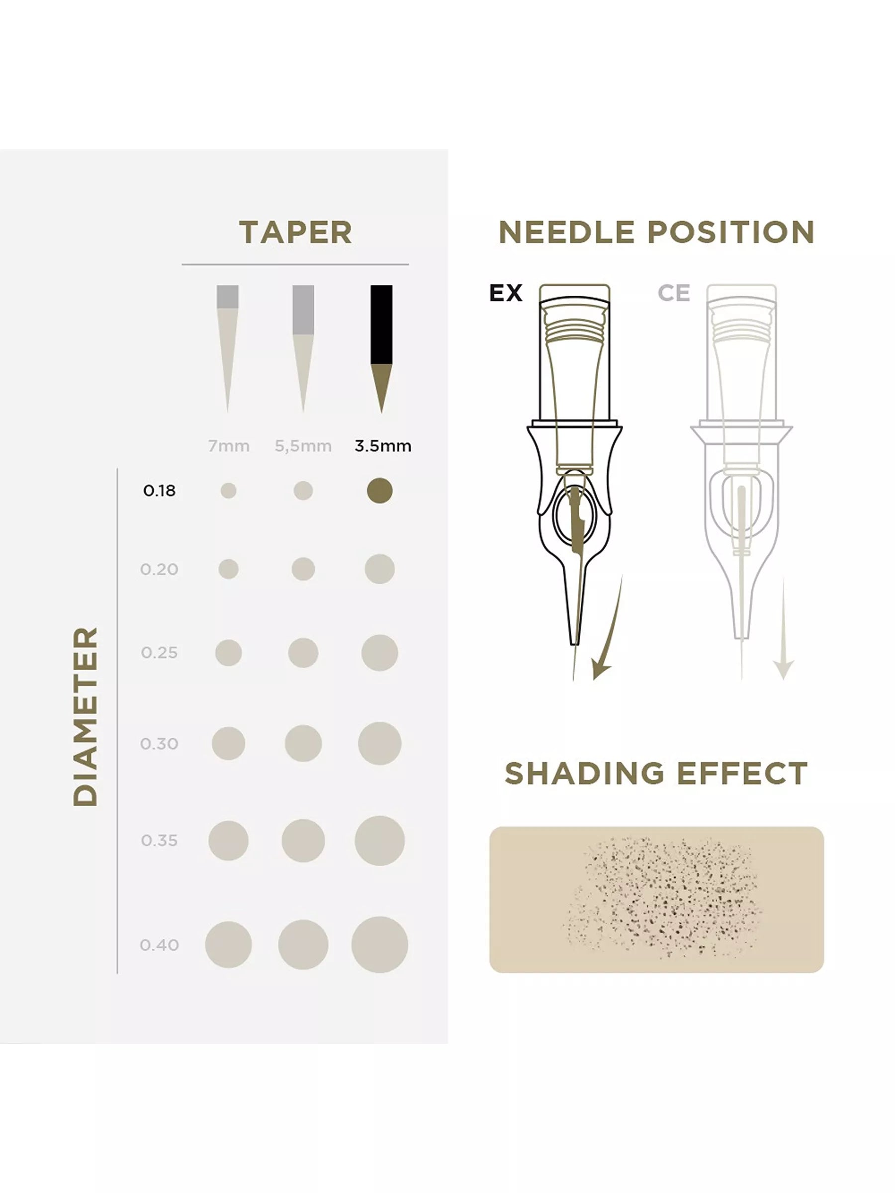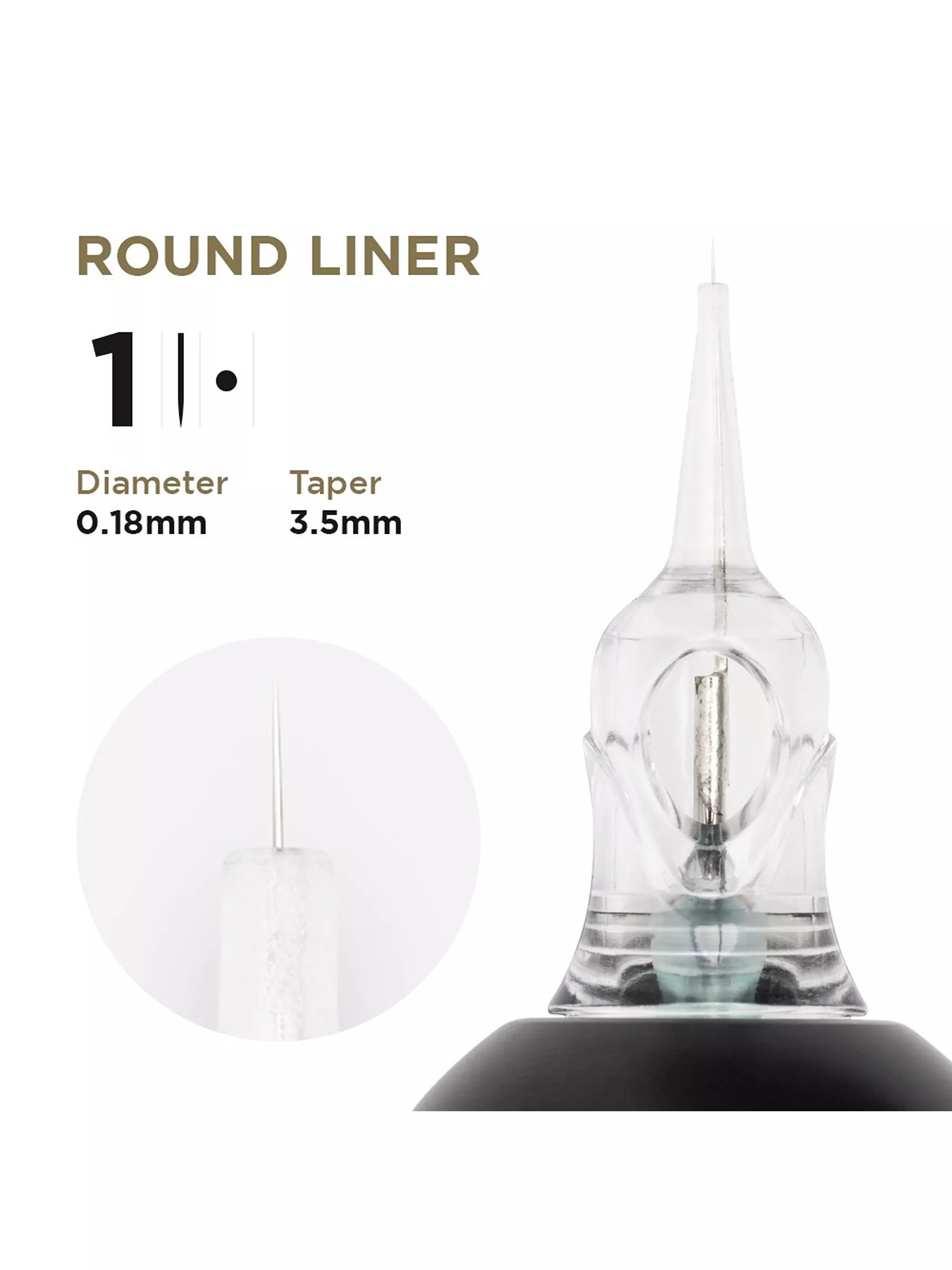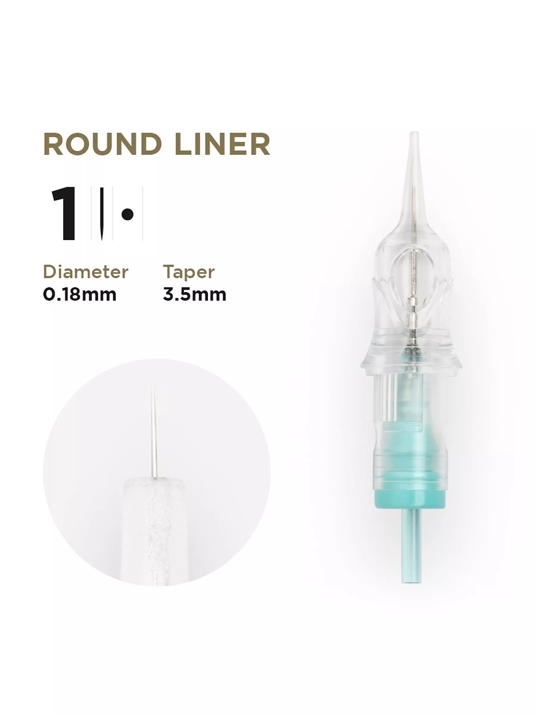 Punta 1R: ideal para detalles ultrafinos tanto en tatuajes como en PMU. Ofrece una precisión perfecta para diseños intrincados, trazos de cabello y delineado detallado en tratamientos de PMU.