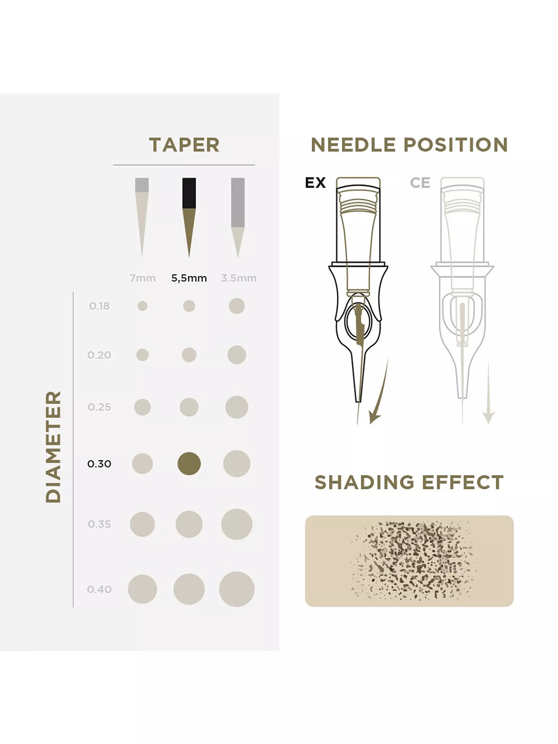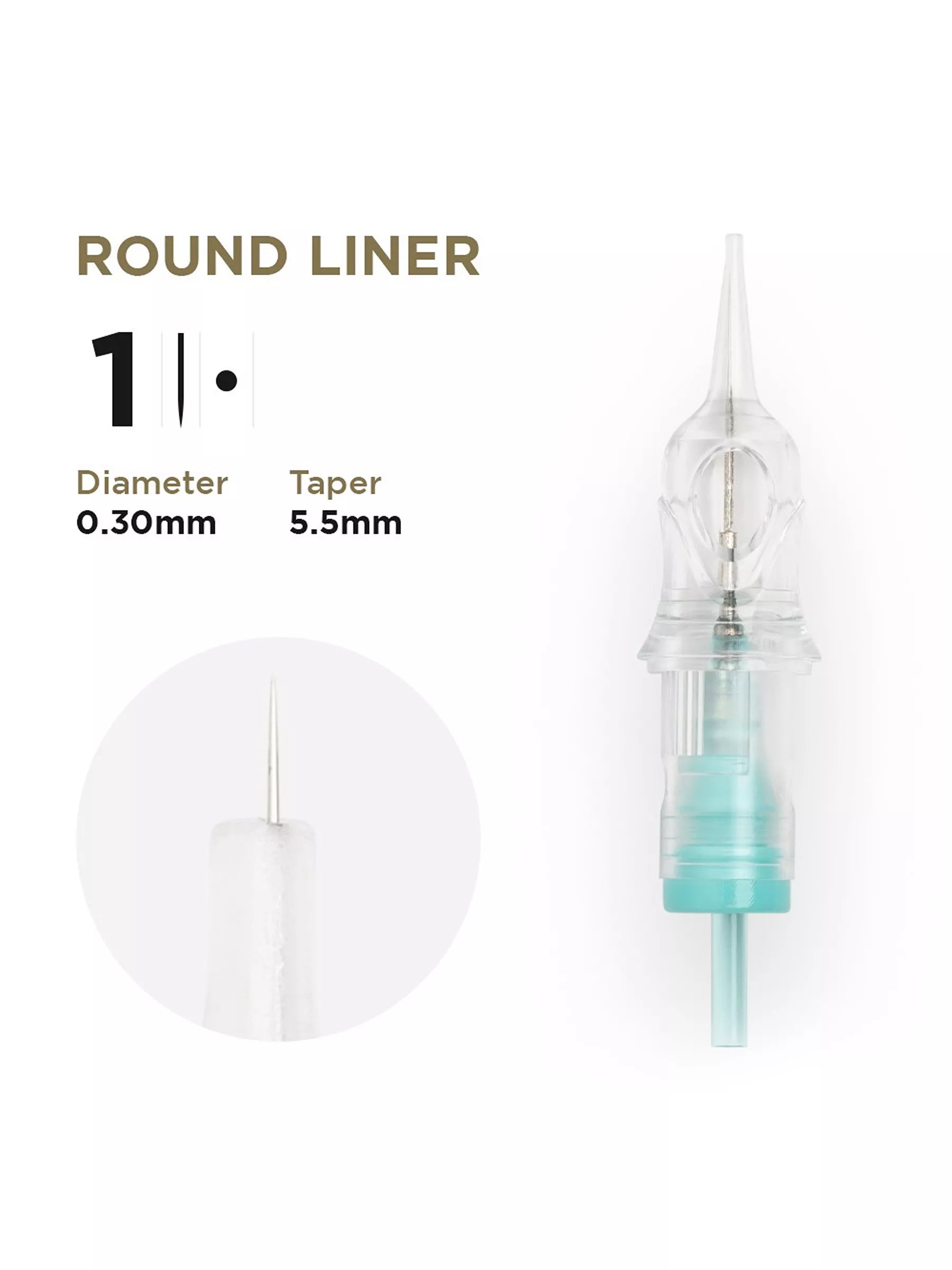 Punta 1R: ideal para detalles ultrafinos tanto en tatuajes como en PMU. Ofrece una precisión perfecta para diseños intrincados, trazos de cabello y delineado detallado en tratamientos de PMU.