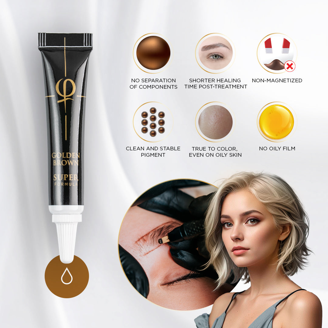 Los pigmentos SUPER han establecido nuevos estándares en la industria: · Pigmento limpio y estable. · No magnetizado · Sin separación de componentes · Sin película aceitosa · Fiel al color, incluso en pieles grasas. · Menor tiempo de curación después del tratamiento. El color del pigmento debe elegirse de acuerdo con el color natural del cabello del cliente. Marrón 1: Cabello naturalmente rubio o castaño claro. Marrón 2: Cabello castaño natural Marrón 3: Color de cabello natural castaño oscuro, casi negro. Castaño dorado: color de cabello natural extremadamente claro Fox: color de cabello con pigmento rojo natural Los pigmentos negro, rojo y amarillo se pueden mezclar para crear todos los tonos mencionados anteriormente. Es importante consultar detenidamente la teoría del color del microblading para lograrlo.